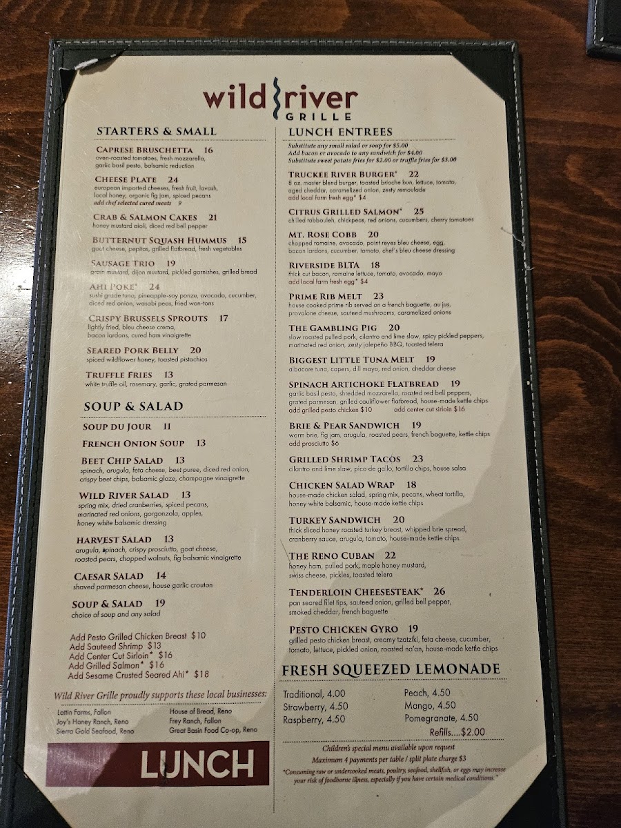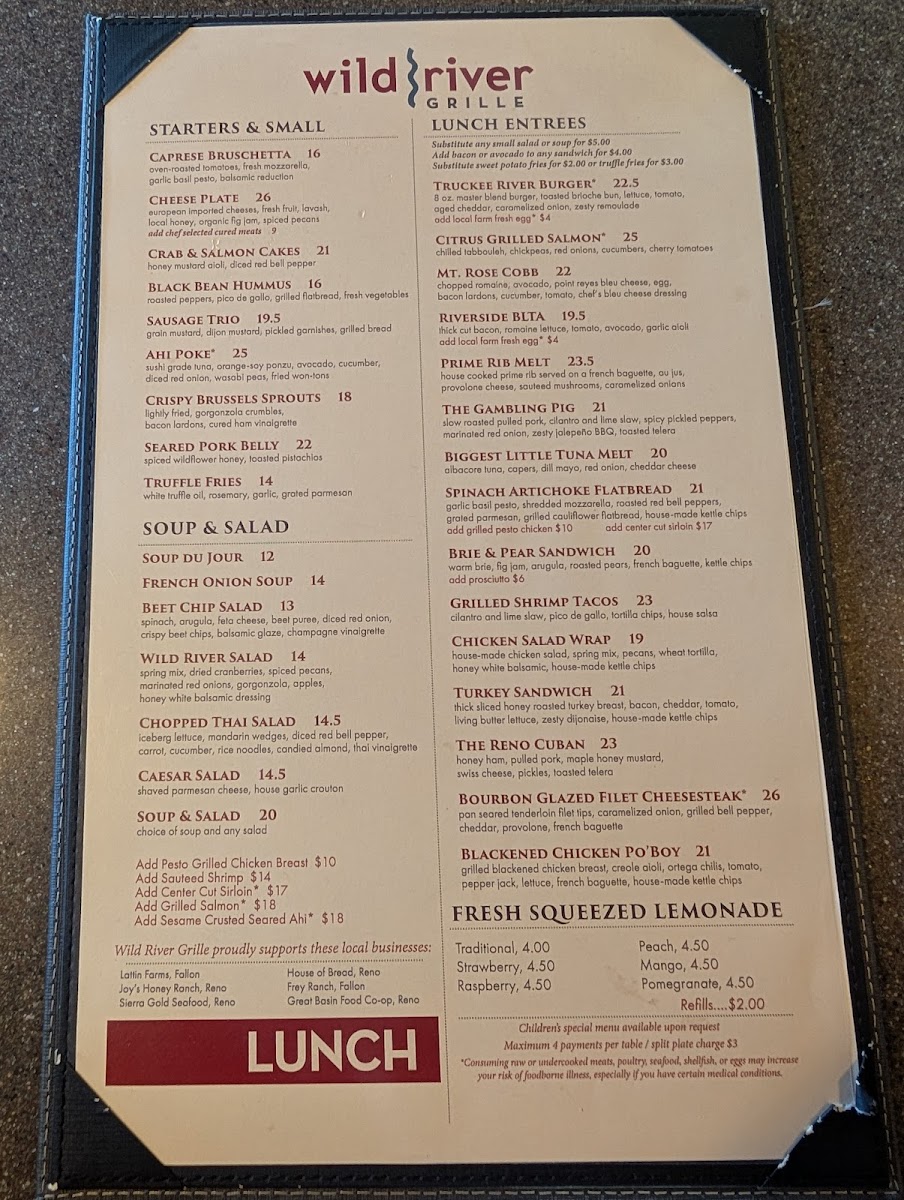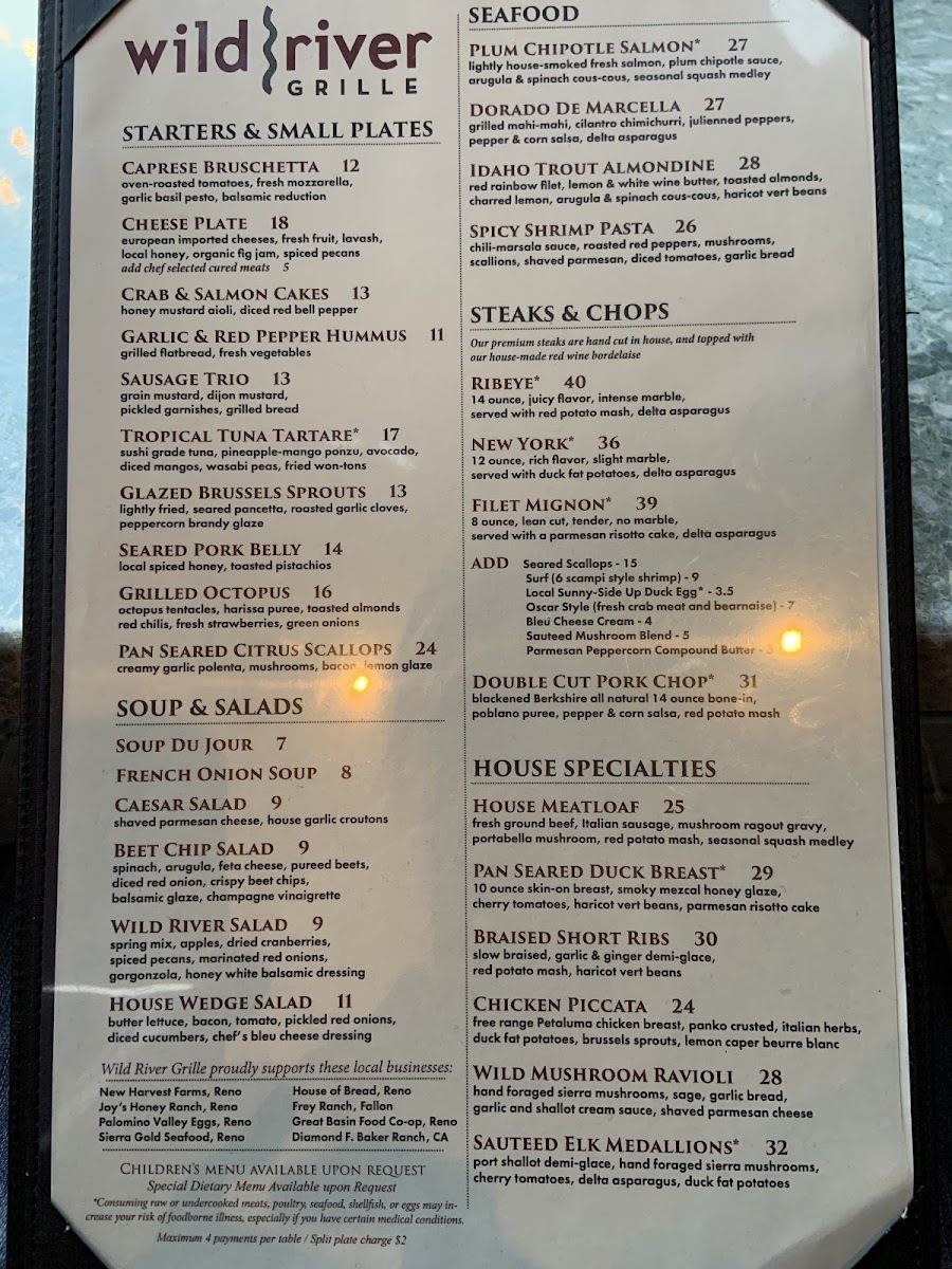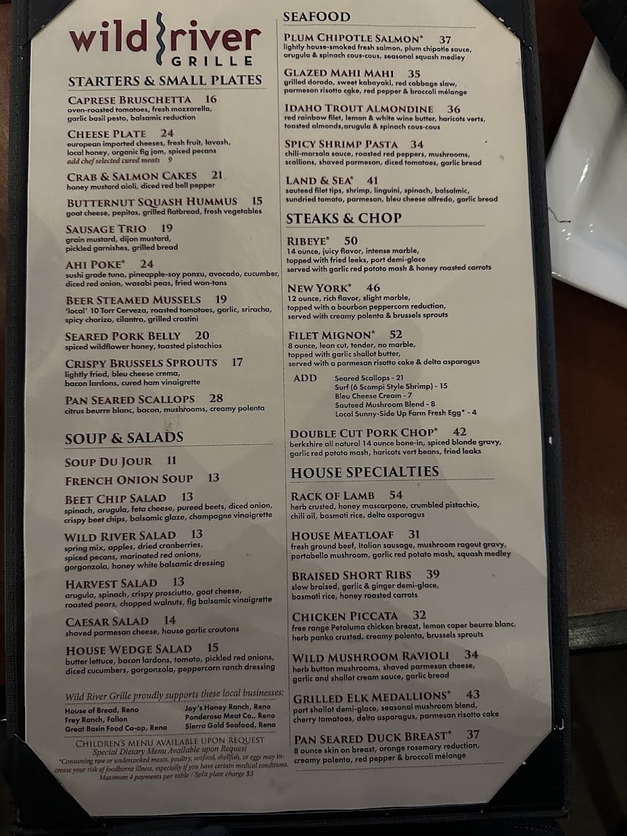 Introducing the menu at Wild River Grille, located in the heart of Reno, NV, is a culinary adventure that captivates the senses. This restaurant masterfully combines casual elegance with a menu that features exquisite seafood, steaks, and inventive small plates. Start your meal with the Braised Bacon, infused with local smoked honey, or the vibrant Spicy Tuna for a touch of zest.